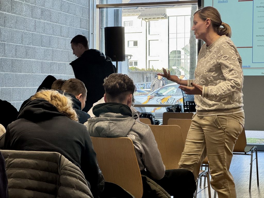 Um den Überblick zu behalten, stellte Edda Roggentin-Gering verschiedene Informations- und Suchportale vor. Für die Berufsorientierung empfahl sie unter anderem den Online-Test Check-U der Arbeitsagentur sowie das Studienorientierungsportal was-studiere-ich.de. Für die Suche nach Ausbildungsplätzen und Studienangeboten verwies sie auf das Suchportal der Arbeitsagentur, hochschulkompass.de und studienwahl.de. Zudem wurden unterschiedliche Hochschulformen sowie das duale Studium näher erläutert, das Theorie und Praxis miteinander verbindet.