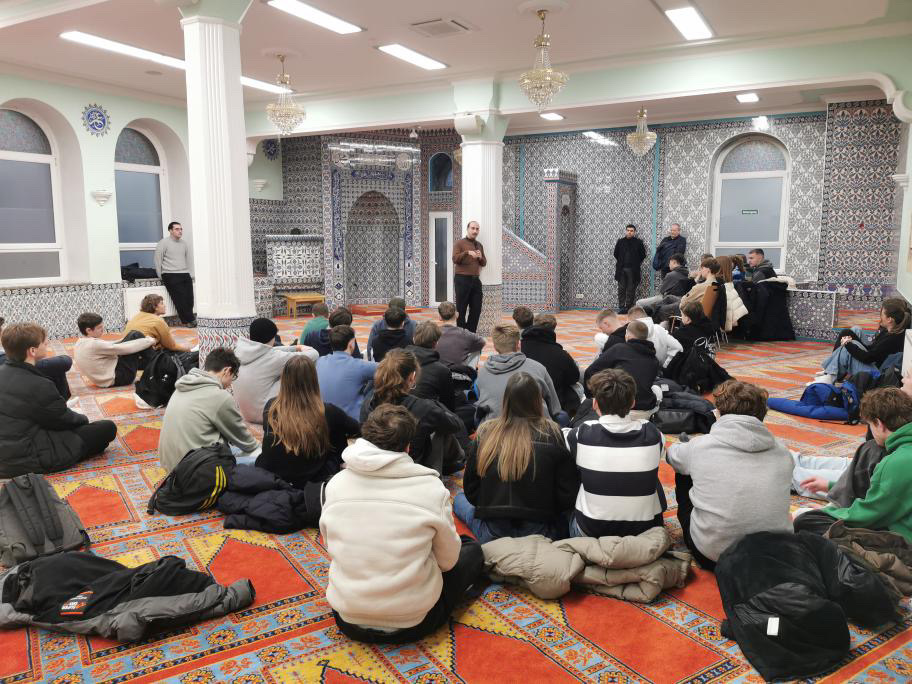 Begrüßt wurden sie vom Wohnheimsleiter Mustafa S. Alkan. Der Imam Enes Damar erklärte der Gruppe den Aufbau der Moschee und erläuterte die Bedeutung des Gebetsraums. Dabei nahm er sich viel Zeit, um die zahlreichen Fragen der Schülerinnen und Schüler zu beantworten – etwa zu religiösen Ritualen, Glaubensgrundsätzen und dem muslimischen Alltag. Eindrücklich war auch der Ruf des Muezzin, den ein Mitglied der Gemeinde vorführte.