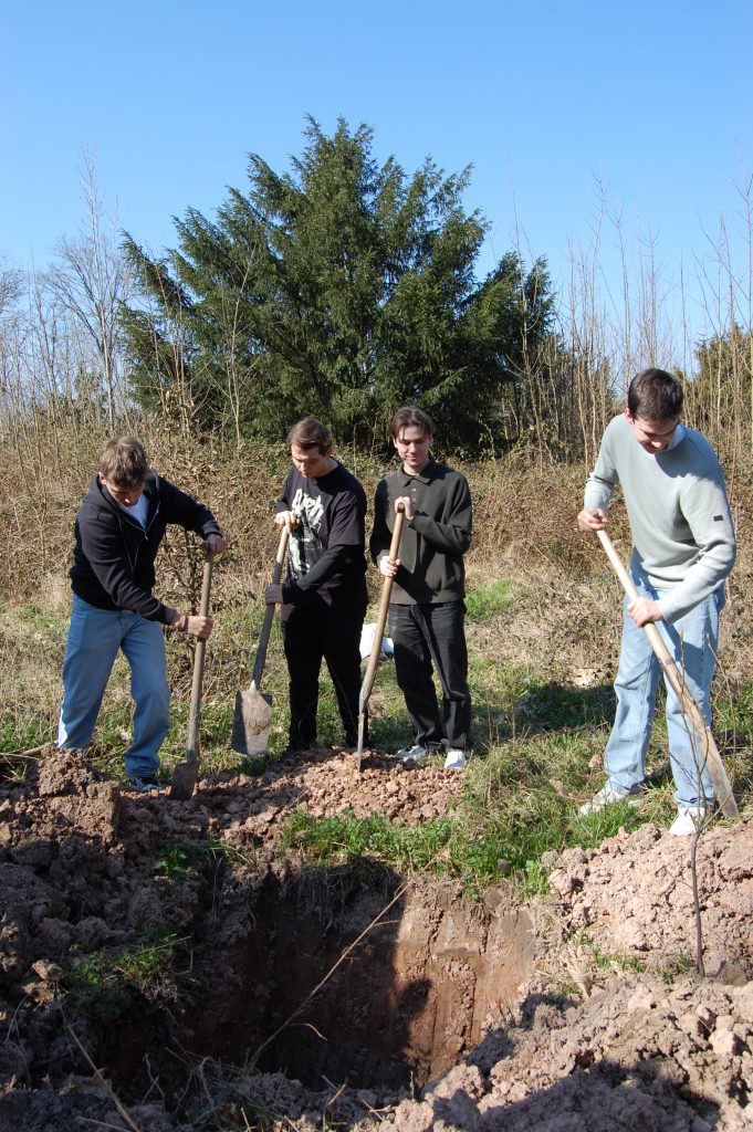 Mit vereinten Kräften galt es zunächst, den bereits 15 Jahre alten Baum aus dem Pflanzgefäß zu schälen und ihn in das vorbereitete Loch zu setzen. Während Forstwirt Steffen Jung den Baum in Position hielt, schaufelten die Jugendlichen die zuvor zerkleinerte Erde zurück ins Pflanzloch. Alex Westermann von W-Quadrat aus Gernsbach verfolgte die Aktion interessiert und freute sich über das Engagement der Jugendlichen. „Toll, dass Sie nun bereits zum zweiten Mal unseren Abi-Baum sponsern“, wandte sich Schulleiter Sven Teichmann denn auch an ihn und bedankte sich ausdrücklich.